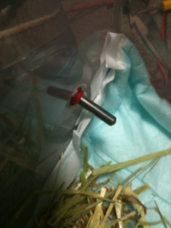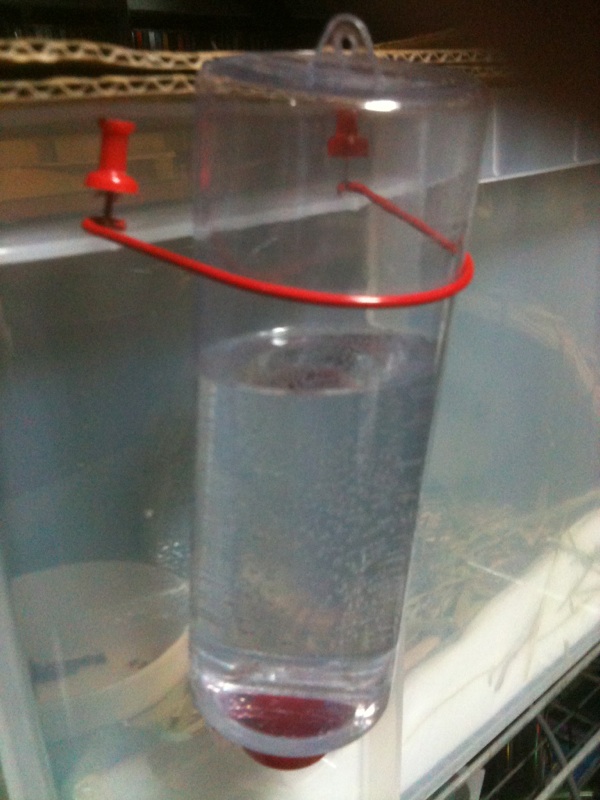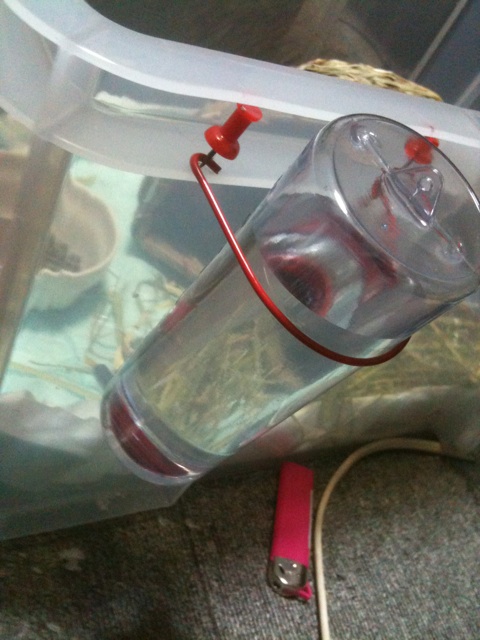モルモット用のケースは棒状の金属を格子状に組んだよくあるものではなく、ただの衣装ケースなので、千枚通しとでかいはさみを駆使して穴をあけた。ここから水ケースの飲み口をにょきっと出した。