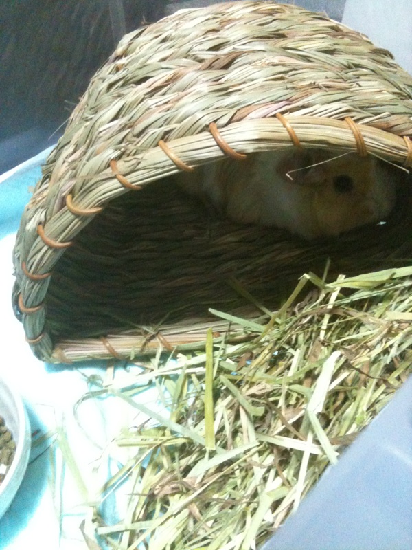 小屋の中には大方なれたようで、段ボールでフタをしてやるとすぐに小屋から出てペレットやアルファルファをもしゃもしゃやりはじめた。この状態で近づくだけではフリーズだけなので、じゃあ段ボールを取って慣れさそうかな、なんてことを考えた。
