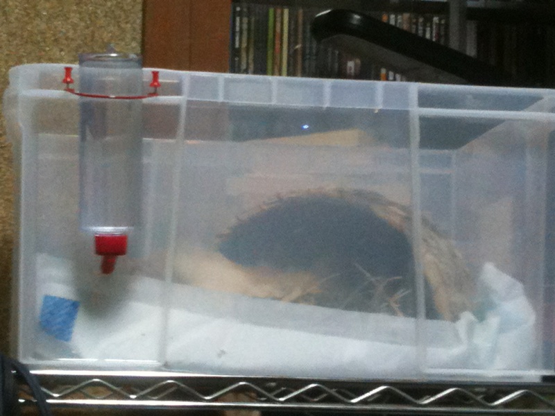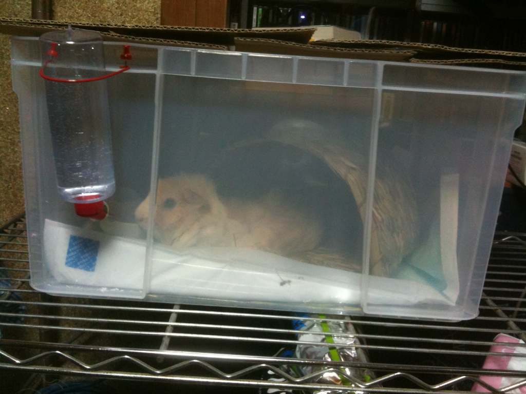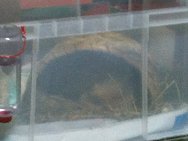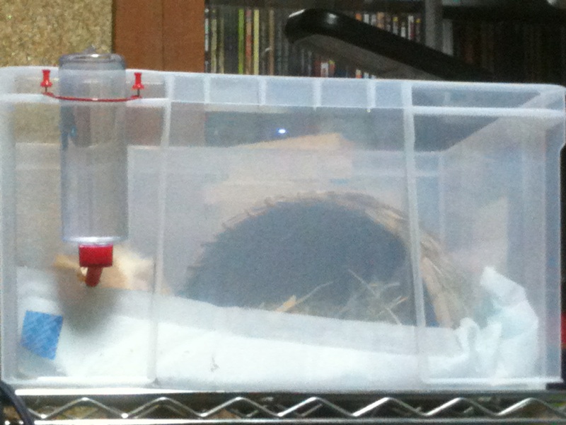 水が著しく減っていたので、部屋が暑かったのだろう。小屋の外にでていたのもそのせいだと思われる。部屋を掃除してご飯と水をいれた。昨日は掃除が終わってからしばらく放心状態であったが、今日は掃除をし終わってすぐにご飯を食べ始めた。